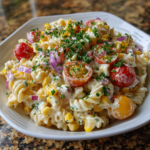 A refreshing and creamy pasta salad featuring sweet corn, perfect for summer gatherings.