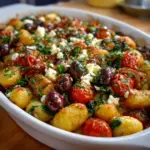 In a large baking dish, combine the gnocchi, cherry tomatoes, fresh spinach, crumbled feta cheese, and sliced olives. I like to use a big dish so everything has room to mingle. Just toss them all in together. It’s like a party in a pan, and everyone’s invited!