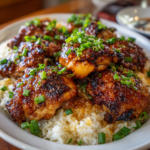 Now comes the fun part! Fluff the coconut rice with a fork and serve it on plates. Top it with the spicy maple chicken, and don’t forget to sprinkle some chopped green onions on top. They add a fresh crunch and a pop of color. Enjoy your flavorful creation!